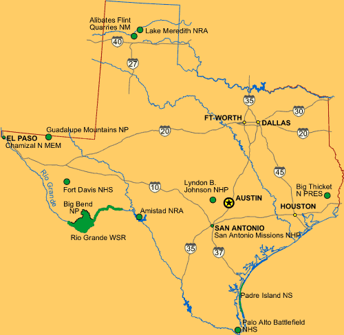 Visit Rio Grande WSRVisit Big BendVisit ChamizalVisit Lake MeredithVisit Alibates Flint QuarriesVisit Guadalupe MountainsVisit Palo Alto BattlefieldVisit Padre IslandVisit Fort DavisVisit Big ThicketVisit San Antonio MissionsVisit AmistadVisit Lyndon B. Johnson NHPLegend
